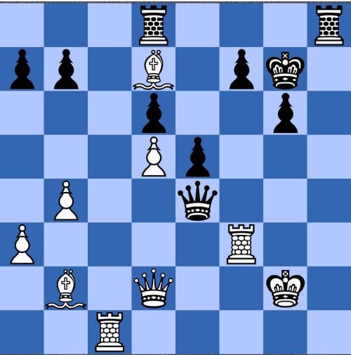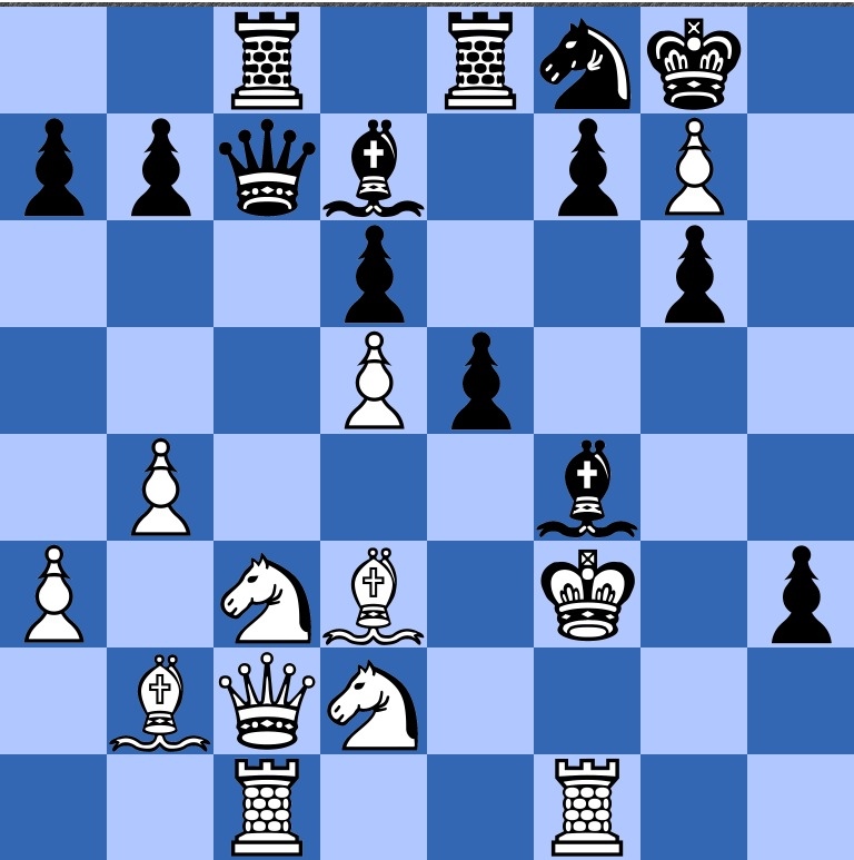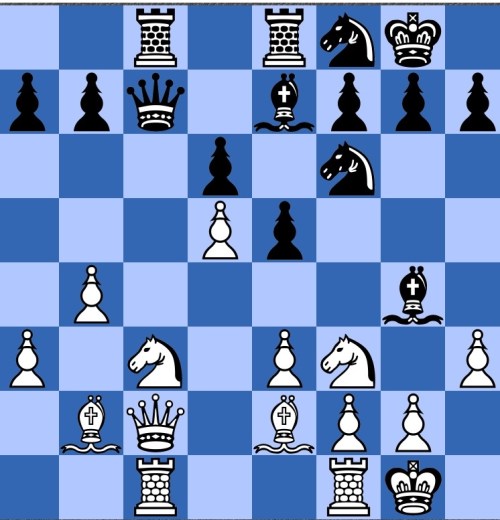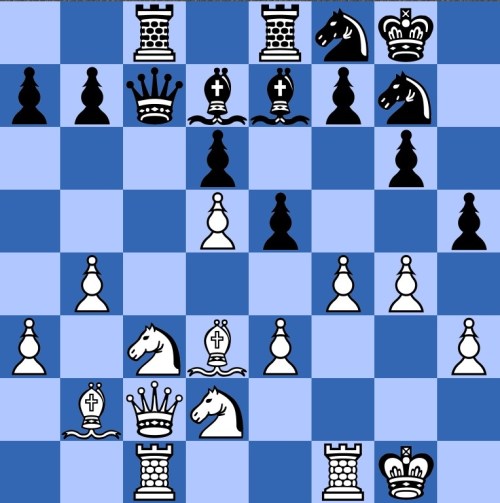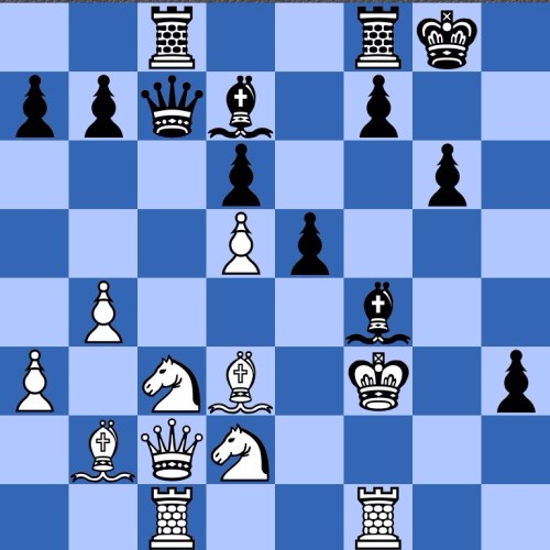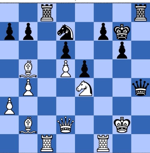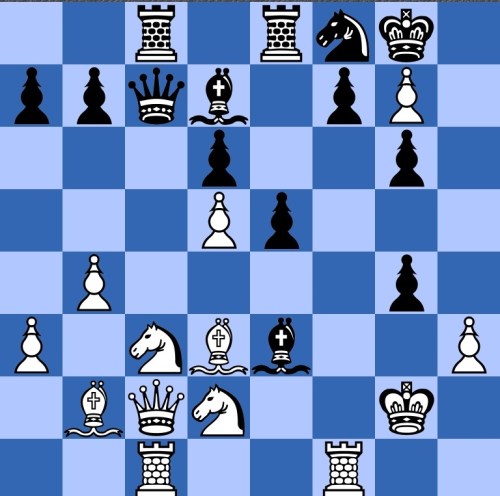 Black has just played 20…h5. Heidenfeld comments that it offers a piece so as to take over the attack himself (21 f5 Bg5 22 f6 Be3+ was played). White's 21 f5 wasn't commented on, but pretty natural to me is 21 fe! de 22 Nde4!.
