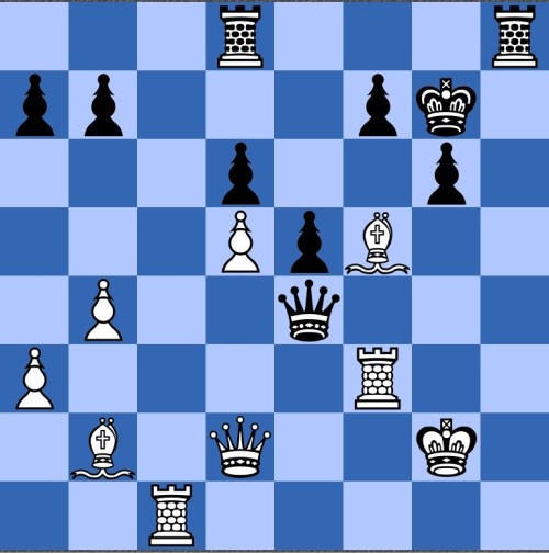 The reason I chose to look at this position is that Heidenfeld has a long (for him) commentary on the alternative to the move played (32 Qf4!, and 1-0 after a further few tactics) saying that Bob had relied on White playing 32 Bd7? to which the reply was 32..Qe4+ 33 Rf3 Rcd8!!: and I couldn't see why a move such as Rcd8 was so good- so put the position in Stockfish, since I had my iPad with me- and was startled. Firstly, it tells me that 33 Kg3 is clearly winning for white, but after 33..Rcd8 it has a startling answer.