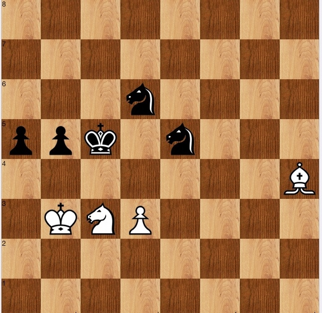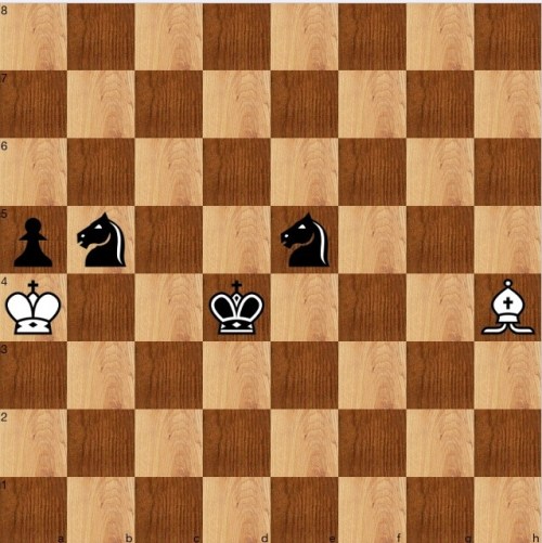 Yet another trivial one (the book is worth sticking with: I am a few ahead now, and they do get harder). A fairly obvious try is 1 d4+! Kd4[] 2 Nb5+! Nb5[] 3 Ka4 when all that needs to be seen is that black can't protect both the Pa5 or Nb5, so one must fall, and it is a draw.
