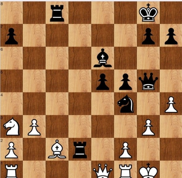 A somewhat more interesting problem: actually, a bit of an exercise, but not too hard. 1. Qg3+! is obvious, and after 2 fg[] Nh3+![] – only move, since 2…Rg1+, the move I first looked at loses after 3 Kh1[] Bd5 4 Rf4 (or 4 Be4) 4…Re2+ 5 Be4 Be4+ 6 Re4 Re1+ 7 Re1 1-0. But after 2…Nh3+ 3 Kh1[] then 3…Rdc2! ends the game: 3…Rdc2 is not too hard to see since 3…Bd5+? is met by Be4, and then black can't double on the second rank, because the Na3 covers c2: so Rdc2 is a straightforward decoy.