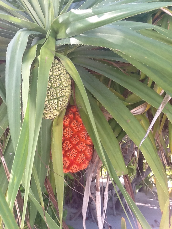 It is from the Pandanus, screw plant family. Wikipedia tells me there are over six hundred varieties. Didi told me that they use the pineapple like flower for food, including eating the visible pods, when red, raw. One of the waiters came over to join us, and they showed me some other Pandanus family plants, and the waiter said the fateful statement: please ask us any other questions, we like it when guests show an interest.