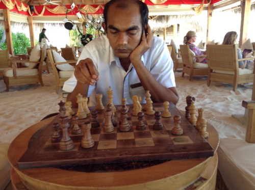 Various waiters came to watch, and a good conversation and a lot of laughter followed. A great thing about chess is that it can start the conversation off on other subjects. We talked a lot about the education system in the Maldives, and how in recent years English has become the language all subjects are taught in, with Dhivehi now only been used in Islamic studies and for teaching Dhivehi itself. Exams are done under Cambridge University syllabi.