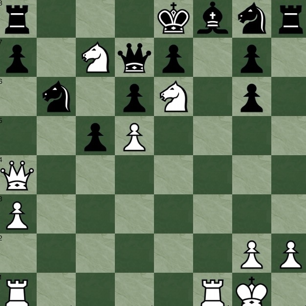 The final position of our final game was somewhat like this (a lot like this: can't be sure of all the minor details). The last two moves were 1 Ncb5 (rather than 1 Q*c4) Nb6 2 Nb5c7 mate, a little combination as a crowd pleaser.