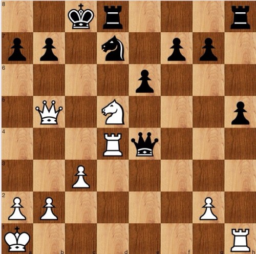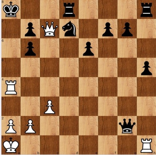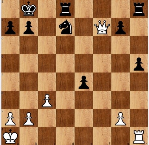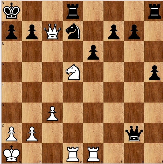 We know that f5 and g6 are mined, so the queen can't go to either of these squares (Ne7+). So, 1…Qe5 is a natural try, seeking to control c7, but 2 Ne7+ Kc7 (Kb8 is one more faster) 3 Rc4+ Kb8 4 Nc6+ 1-0. Therefore, the queen must move somewhere less useful, say 1…Qg2, when the manoeuvre we saw earlier, Qc4+_Qc7+_Nb6+_Ra4 now works.