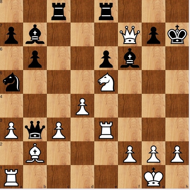 I was pleased to find the following, even though arguably not too hard. 1 Be4! (to biff the queen, to take it off the a8-h1 diagonal, so that the Qg4 is freed, and doesn't need to guard against the Q+B battery aimed at g2) 1…Qb3 2 Bh7+! (Greek gift sacs on h7 always deserve an exclam) Kh7 3 Qh5+ Kg8[] 4 Qf7+ Kh8 5 Re3! (Rook lifts also deserve exclams) when black resigned.