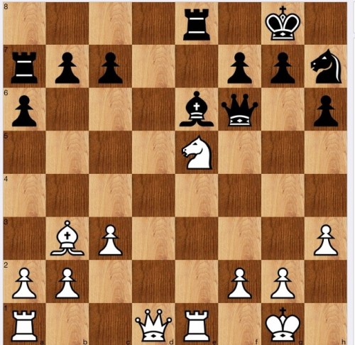 This was, but perhaps shouldn't have been, the hardest for me to visualise. 2 Re8+ Kf7 (2…Nf8? 3 Qb3+ 1-0) 3 Qd7+ (the move it took me a while to see, blinded by the fact that when the bishop is on e6, this move isn't possible) and 4 ab 1-0.