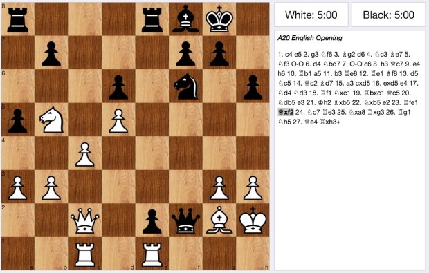 White, a Bulgarian IM, has just played 1 Qc2-e4, but 1…Rh3+! is game over: 2 Kh3[] Qg3 mate. (If instead white had played 1. Kh1, then e1(Q) decides: Qe4 prevents this move but permits a nice deflecting sacrifice.