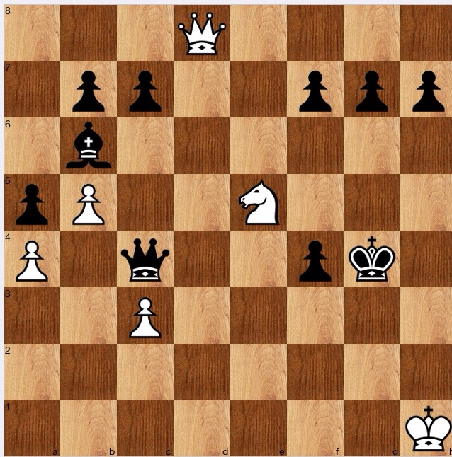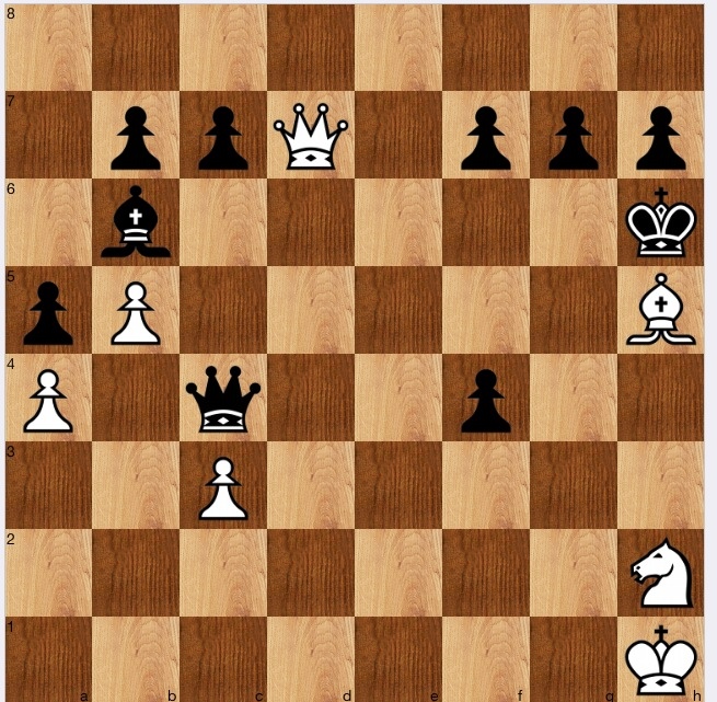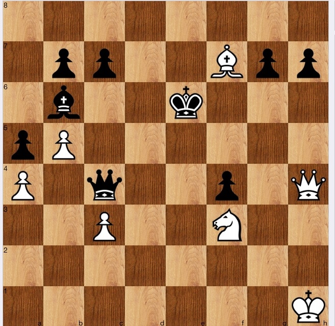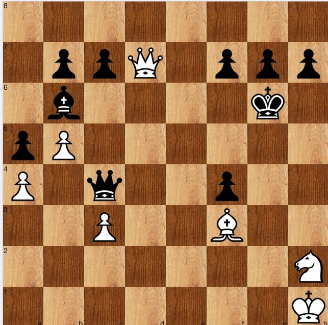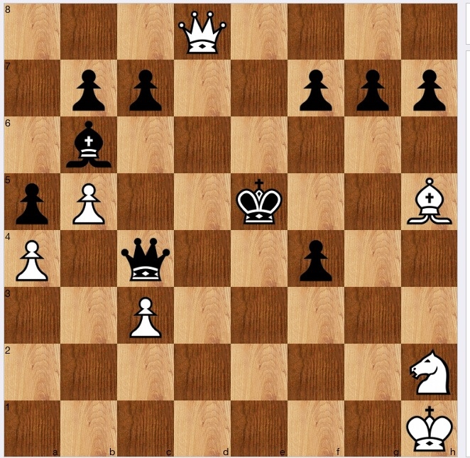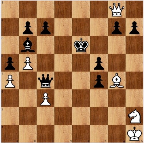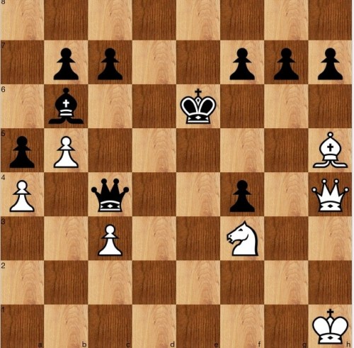 But, why encourage the Nh2 onto f3 where it is clearly improved, which is what 1..Kg5? does. So, 1…Kf6! and the game is level, or, rather, any result is possible. Note that the otherwise pretty 2 Bf7 (which plans 2…Qf7 3 Ng4+ Kg6 4 Ne5+ 1-0) loses to 1…Qe4+.