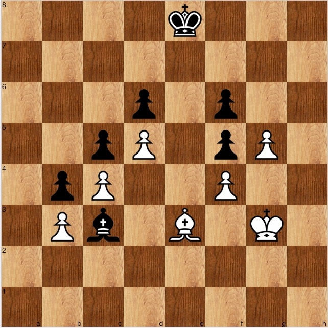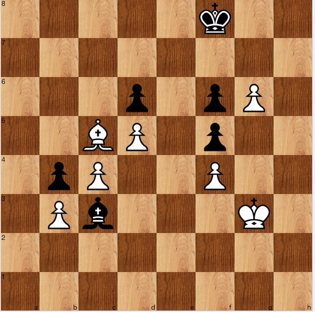 Fairly straightforward again today: 1 g6! with the point that Bc5! will follow, and black's bishop is on the wrong side of his pawns, and his king can't stop both of white's d and g pawns.
