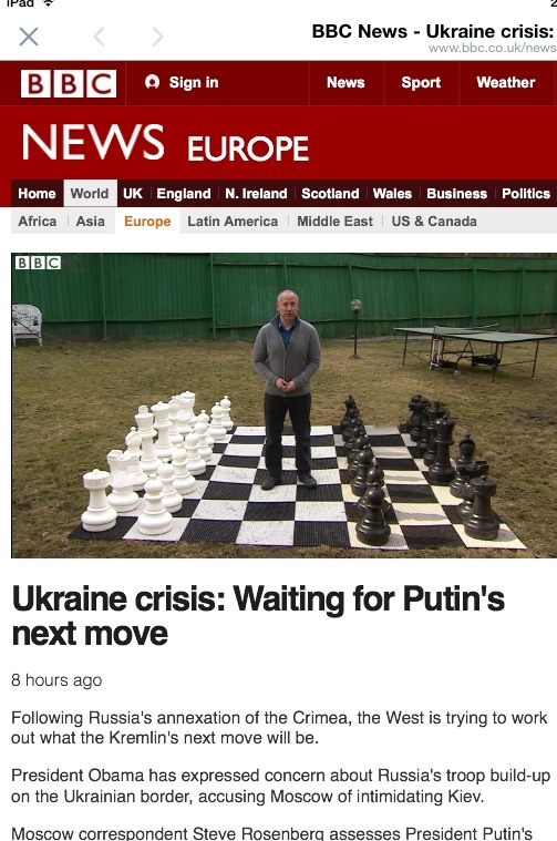 The message I get is: If the BBC is going to use chess as a metaphor for Putin’s annexation of Crimea, they should at least know how to set up the board. Otherwise, the ping pong table in the background would have been a better option.