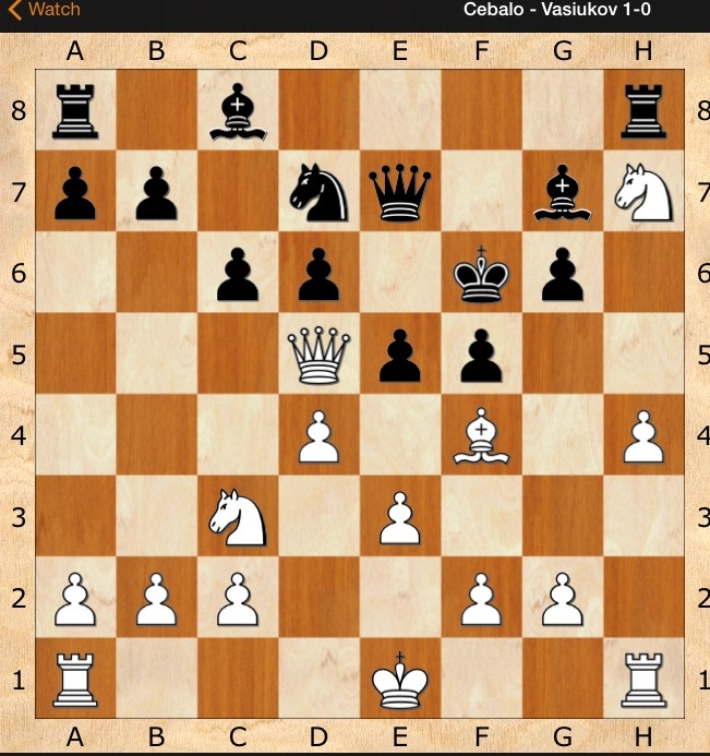 One game struck out: a thirteen move crush by Miso Cebalo against Evgeny Vasiukov in the European Senior's Team Championship. The position below is a nice puzzle: previously (and will be shown in the solution below) there was a standard Bf7+ sacrifice, pulling out the black king with a subsequent Ng5+ and a threat then of Ne6 biffing the queen, but the finish is unusual, and pretty.