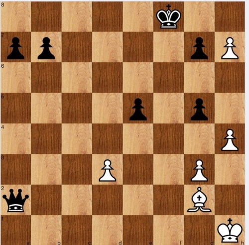 Not too hard today, at least if you know, as we do, that it is a problem with a solution. In a game it would be natural to simply move Q-somewhere, but knowing it is a problem, sacrificing with 1 fg! is a move that has to be thought of.