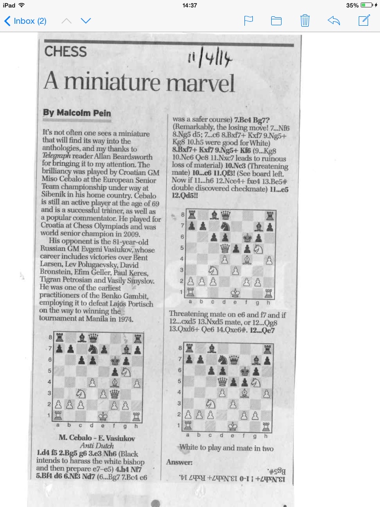 I have read the Daily Telegraph chess column for the best part of forty years. Of course, I don't get the newspaper every day without fail, but I have rarely missed a Mon-Fri edition in the last twenty or so. Nowadays written by my friend Malcolm Pein, it is the reason I get the newspaper.