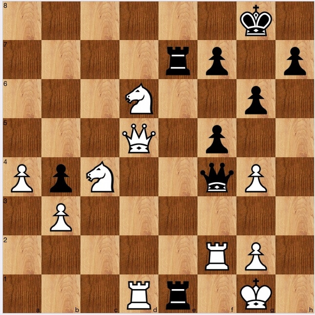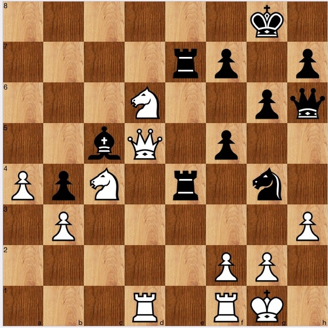 I found this one hard to spot, but applying the mantra consider all threats to biff and biffs includes checks) then 1…Qf4!! was found. White's only try is 2 hg (2 g3 Qg3+, and the f pawn is pinned) when 2…Bf2+ 3 Rf2 (3 Kh1 Qh6 mate is an unusual version of back rank mate) 3…Re1+ and 4 Rf1 Qf1+ 0-1
