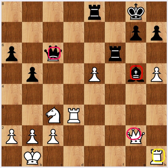 So, 1 Qg2! is a double attack, hitting the LPDO Bg5, and hitting the once-defended Rf3, which is pinned against the LPDO Qc6 (or, Purdy's jump biff notion applies here: from g2, the jump biff Qc6 is 'threatened'. At first, all I needed to check was that 1…Rd3 or 1…Rf1+ didn't cause a back rank nasty, which they didn't…so is that the solution?