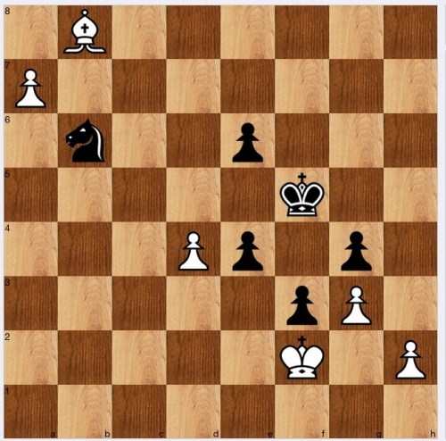 I am not sure about all this. My 'solution' was 1 Bd6, which I think is 'as good as' 2 Bf4, but I am not sure that white is winning in either case. Firstly, in my line 1..e3+ 2 Ke3 Nc4+ still forks the LPDO bishop but after say 3 Ke2 Nd6, the knight doesn't protect a8, so 4 a8(Q) wins. Instead, though, after either 2 Bf4 or 2 Bd6 (or indeed after the game continuation 1 Bc7 Na8 2 Ba5, are such positions winning? I think black might be able to oscillate with his king ad nauseam, since if the B doesn't protect f2, white can never take on e4: and if the B is on the g1-a7 diagonal, then black can keep his king on f5 and oscillate with his N between a8 and c7.