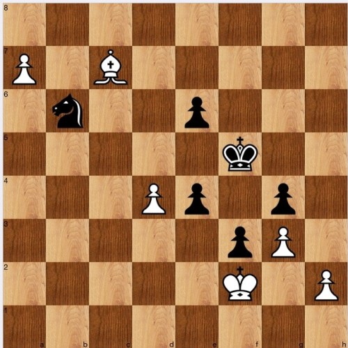 Not too hard: examine all biffs means that 1…e3+ has to be considered, when if 2 Ke3, Nd5+ forks the Ke3 and LPDO Bc7. And if white doesn't take on e3, black wins after 2…Na8 and 3 Ke4.
