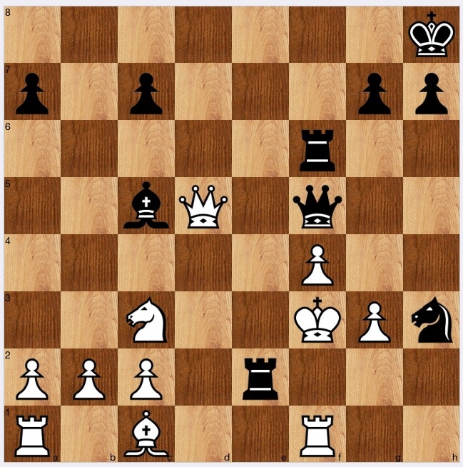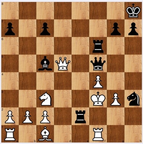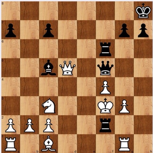 Very pretty: 1….Ng1+! 2 Rg1[] Rf2 mate. In the game, black played 1…Re5 and won eventually.