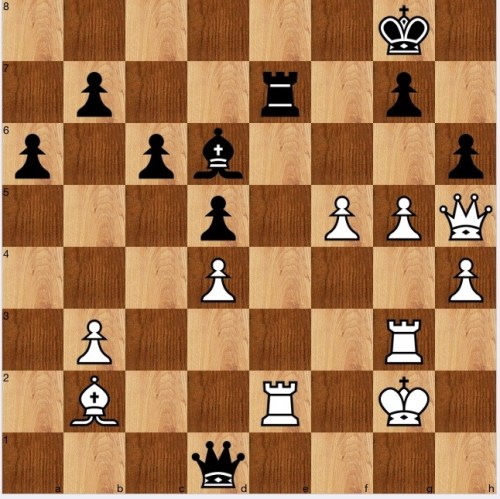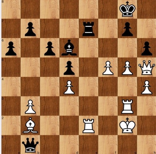 Black's situation looks dire, and Reitstein says that he resigned in this position. But knowing that it is a problem (and I think that is key: it would be so easy to give up here in practice) the solution is simple: 1…Qd1, pinning the LPDO rook against the LPDO Qh5, and if 2 Kf2, 2…Bg3+ wins.