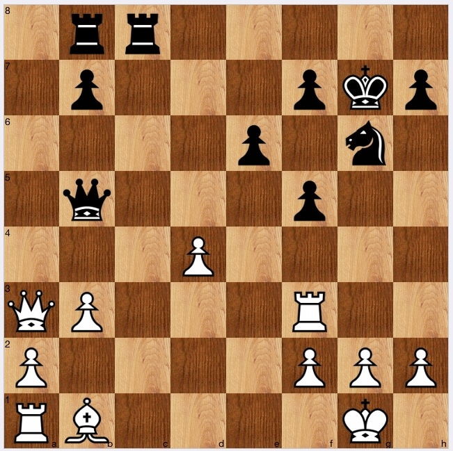 Fairly straightforward today- I got this one immediately, since it is a fairly standard motif of back rank mate. In Purdy terms, the Qa3 is tied to defending c1, so 1…Qb4 or 1…Qa5 wins the queen. I prefer 1…Qb4 aesthetically, since 1…Qa5 permits 2 b4, but even then 2…Qa3 and if 3 Ra3 Rc1 mate.