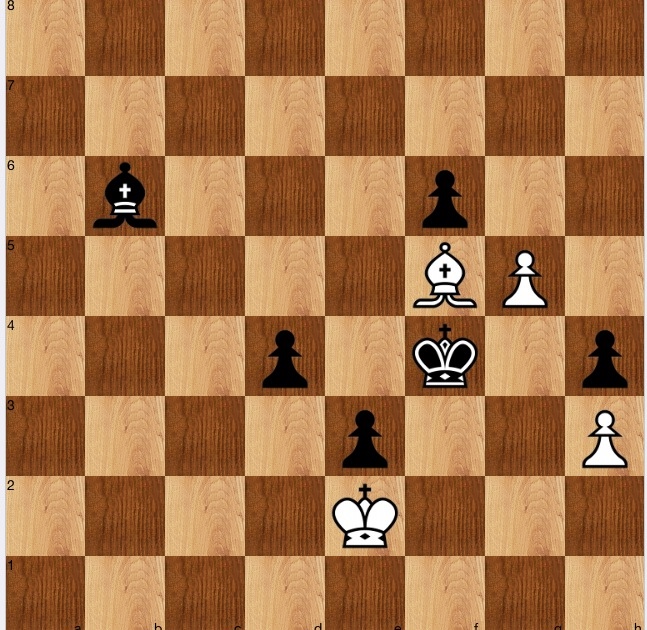 Ben suggests 1…Kf4! which is a great try. Firstly, moving the bishop somewhere is hopeless: 2…Kg5 and the active king and three central pawns will defeat white: white's king will be a bit like King Canute and despite what he and his bishop might think, the wave of pawns will come to shore.