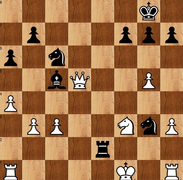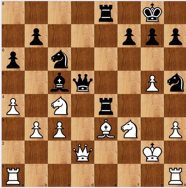 Reitstein gives this as a 'find a pleasing mate' problem, so I did: 1…Re3 is obvious (but I also looked at 1…Rg4+?? 1…Rc4, 1…Be3 and 1…Qd2+, to examine if not all biffs, most biffs). In a game, I would have played 1….Re3! with little thought. It is obvious that it wins (and, proving that we are in the year of the engine, I quickly evaluated the position as -10 or more; in fact, when I switched Stockfish on, it said -15).