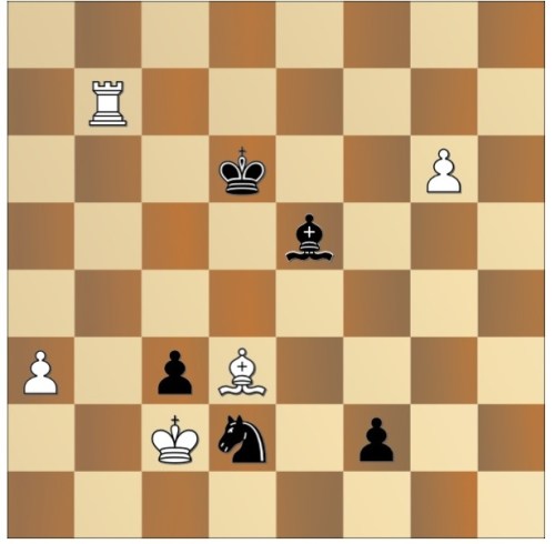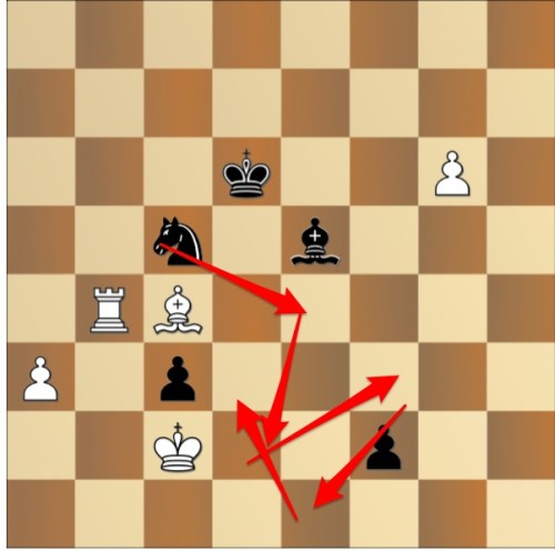 The position looks dire for black, with seemingly no way to promote the f pawn, and the likelihood of having to exchange one of the minor pieces for the g pawn.