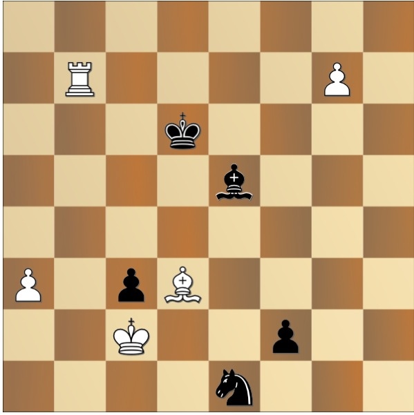 The position looks dire for black, with seemingly no way to promote the f pawn, and the likelihood of having to exchange one of the minor pieces for the g pawn.