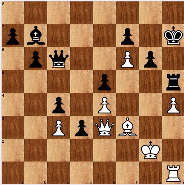 Black looks in a bit of a mess, with the threat of h5; however, he has his pluses, mainly the a8-h1 diagonal- the white king is potentially open, and the Rh1 sits behind the Kg2.