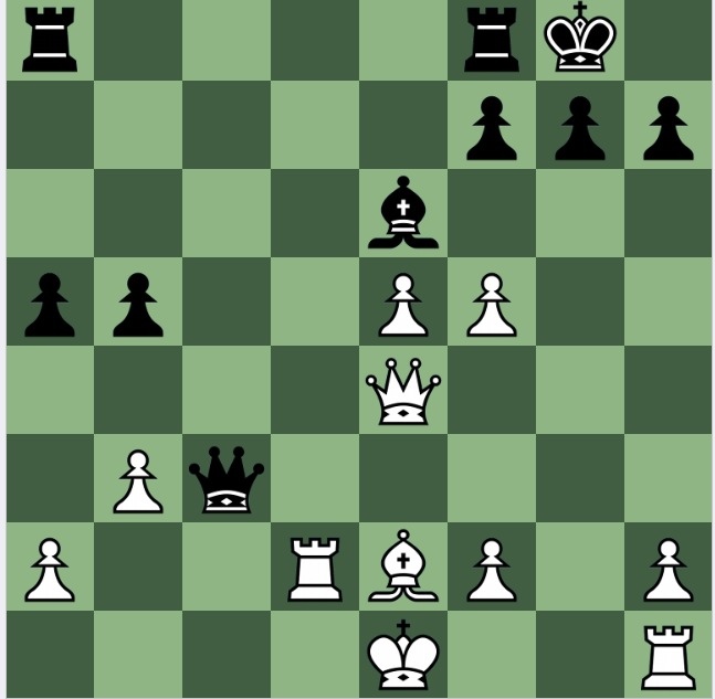 I am not convinced that black is winning. For instance, if black tries to keep a pawn on the queenside, by 4…b4, white can play 5 Bc4 threatening both to take on a5 and to advance his king pawn to e6, when black may be forced into passivity. So, instead, 4…a4 5 Rb5 ab 6 ab Qd2 7 Bc4 Qg5+ 8 Kh1 Qf5 reaching the following position: