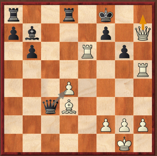 1 Qh6! and white wins. The main line is 1….Qc3 2 Qh7+ Kf8[] 3 Re6! reaching the following position, where there are still variations to explore.