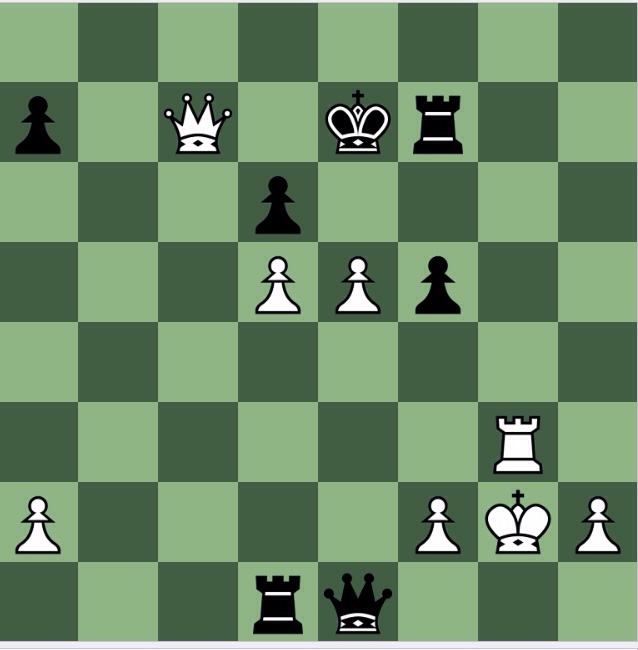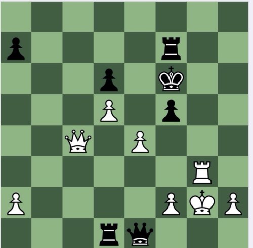 Black plays 4…Rd5[], an only move, but sufficient to I think at least cause white significant conversion difficulties. There’s no mate, and Stockfish doesn’t show me a forced tactical line whereby a rook drops off, so it is Q+3 v RR+3: a draw, I suspect.