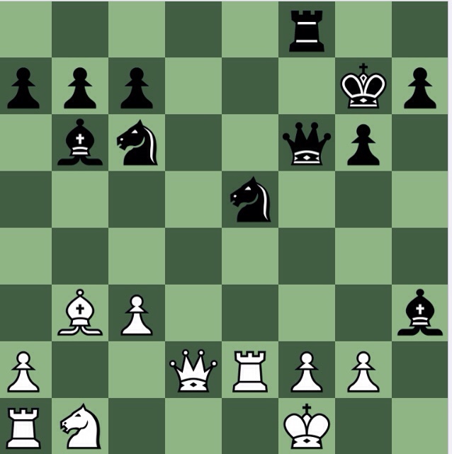 This is quite similar to yesterday's position, with g2 and the white squares being key: 1…Bg2+ 2 Kg2 (2 Ke1 or 2 Kg1 loses to the Nf3+ fork) 2…Qf3+ and mates, since if 3 Kg1 Qg3+ can be played, because the f2 pawn is pinned by the Bb6: so a check or two more, and Nf3 is mate.