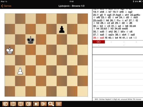Some of his articles have anecdotes from games. He doesn't give the game scores or positions, just alludes to, and those which take my fancy I then have to look up. One of which is Ljubojevic – Browne, Avro 1972.