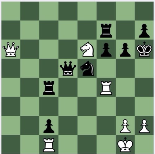 Not much of a puzzle today. Black's c2 pawn is dominating, his pieces well centralised, and white's only trick is the threat of Rh4 mate if it were possible…but the c4 rook prevents it. So, simplify, and hope. 1 Qc4 Qc4 (1…Nc4 2 Rh4+ Qh5 is no different) 2 Rc4 Nc4 3 Rc2 and hope that the ending is drawn.