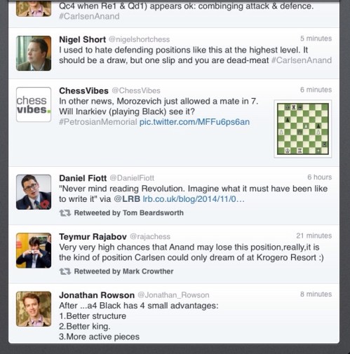 Nice to have beaten Chessvibes in breaking this. It is doubly nice since my tweet was sent one minute precisely before the twelfth anniversary of my mother's death. I always do just what I want to on the 8th November, never working, and yet again have had a lovely relaxing day. Each year I do something different and today, amongst other things, I have been watching game 1 of the Carlsen-Anand world championships in Sochi, and also today's action in Tashir, at the Petrosian memorial.
