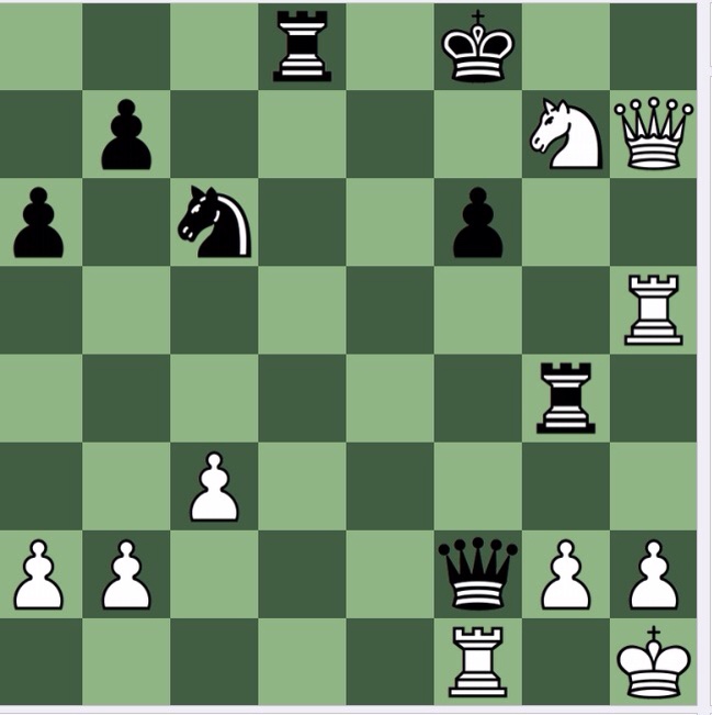 The win then is fairly straightforward: 1 Ne6+ Ke8[] 2 Qh8+ and 3 Qd8+, and then taking on f2.