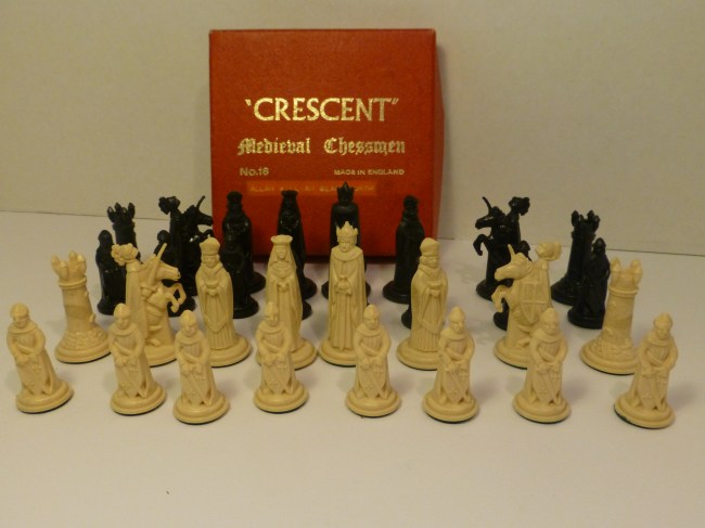 I used to play with the pieces with a cheap green and white plastic roll up board, which, to my recollection, never unrolled fully, later replaced with a black and white cardboard board: in preparing this series of blogs I have not come across either, but hope I will do so one day.
