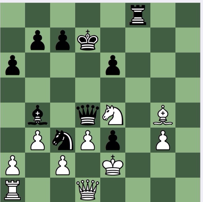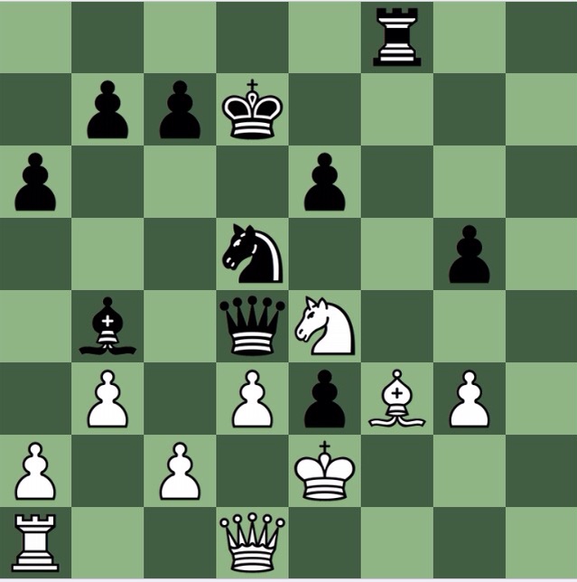 Not too hard today, because the obvious 1…Nc3+ wins (Stockfish has it at -7) but the alternative move order 1..g4 is clearly better. Stockfish spoils the fun by initially evaluating it as -150 before, after half a minute or so, switching to mate in 11. But all a human needs to see is 2 Bg4 Nc3+ and either the queen is lost or Qg4+ follows, ruinously.