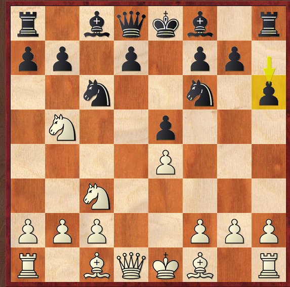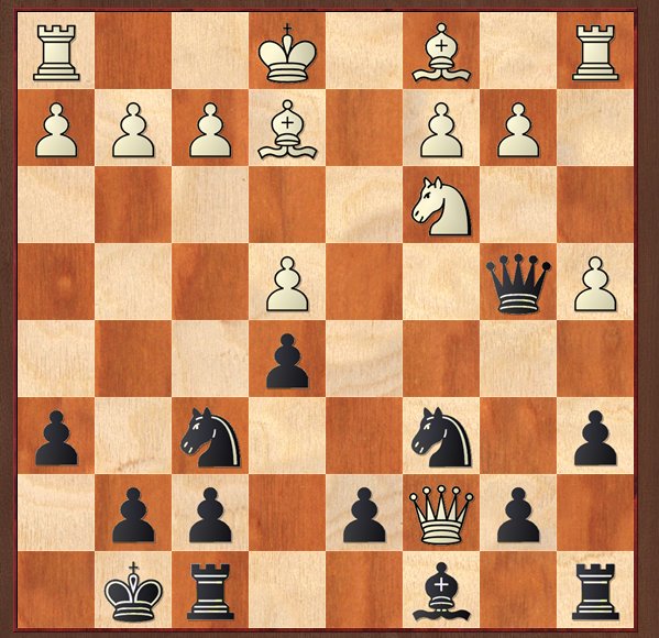 Most people play 7 Nd6+ Bd6[] 8 Qd6 Qe7 and then the queens come off, but in today’s problem game white played 9 Qc7, resulting after a few normal moves in the game position. Black threatens Ne4 because of the pin, and in the game white castled, maybe planning Nd5 if I captured the e4 pawn, but (1 0-0) 1…Ne8! traps the queen.