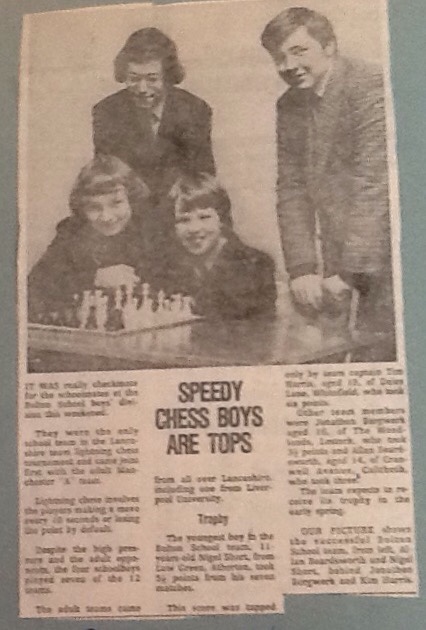 No mobile phones, and I suspect I didn't even have a camera then, so no pictures from the earliest days. The earliest picture I have (though, to be honest, I am now going to trawl through old photo albums and other papers) is from the Bolton Evening News, 29th November 1976. By then Nigel had joined me at Bolton School, where we spent our senior school years together (winning the National Schools chess tournament). Our first win was the Lancashire team Lightning (10seconds a move) with our colleagues Jonathon Bergwerk and Kim Harris (the article has his name wrong as Tim).