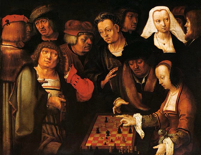 My friend's question has given me much pleasure, browsing, thinking, piecing things together. One picture I came across was Lucas van Leyden's (1494-1533) The Chessplayer's: