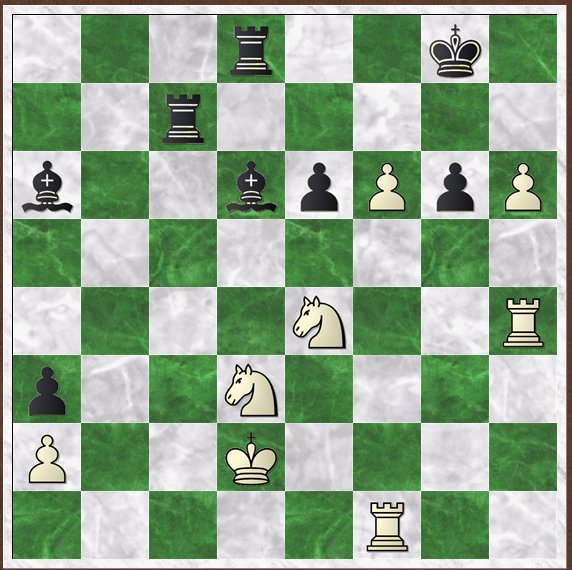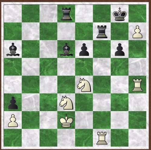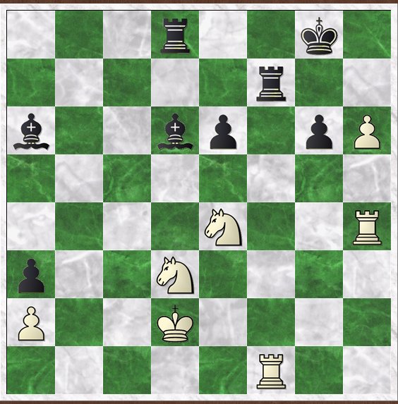 Not too hard today, but some calculation needed, noting that Black threatens something like …Bb4+ or …Bd3, in one order or the other. But 1 f7+ (examine all biffs) forces 1…Rf7 (else 2 Nd6 and either the f or h pawn promotes) when 2 h7+ (examine all biffs again) overloads the King. The King is tied to the Rf7 and also the h8 square, so 1-0.