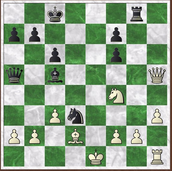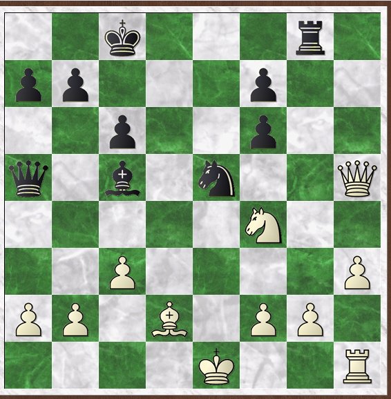 Not too hard today: examine all biffs, combined with Purdy’s concept of jump-biffs (Qa5*h5) results in 1..Nd3+! and if 2 Nd3, Bf2+ wins the Queen, or if 2 K moves, 2…Nf2 wreaks havoc.