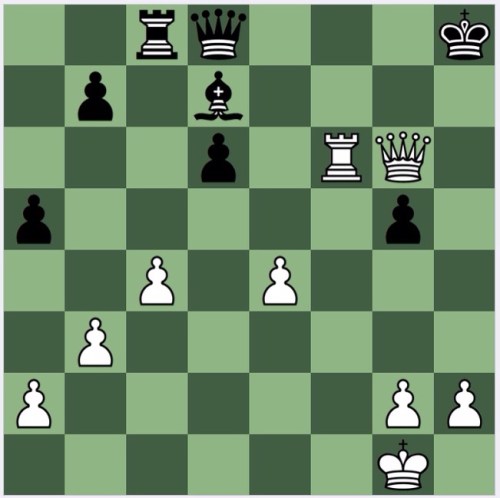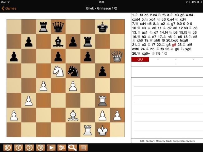 White made a wonderful sacrifice, 23 Rf6!! to reach the puzzle position. Wonderful because it is dramatic, though in fact it was forced, since otherwise his Queen was about to be trapped by …Rf7-h7. So, I suspect, Bilek was baling out a well played Maroczy Bind game for a draw.