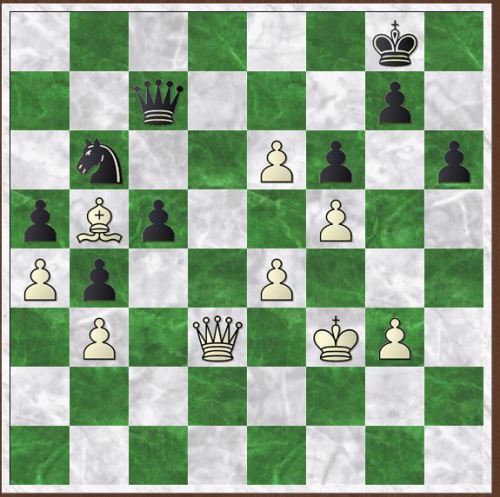 A difficult one. I knew instantly the answer had to be, and it is, 1 e5, with the idea of 1…fe 2 f6 and 1-0 (I think the main line is 2…gf 3 Qg6+ Qg7 4 Qe8+ Qf8 5 e7!) but 1….Qe5 is clearly the move to play, with the hope of a perpetual.