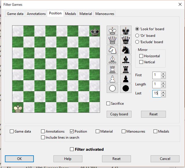 Prior to having read Jon Edwards’ book ChessBase Complete, I wouldn’t have known whether the statement was true or not, but having learned how to do at least basic filters, I decided to check the position. The easy part in ChessBase is to put the pieces in the diagram; the key nuance is to limit the search to a last move of 15.