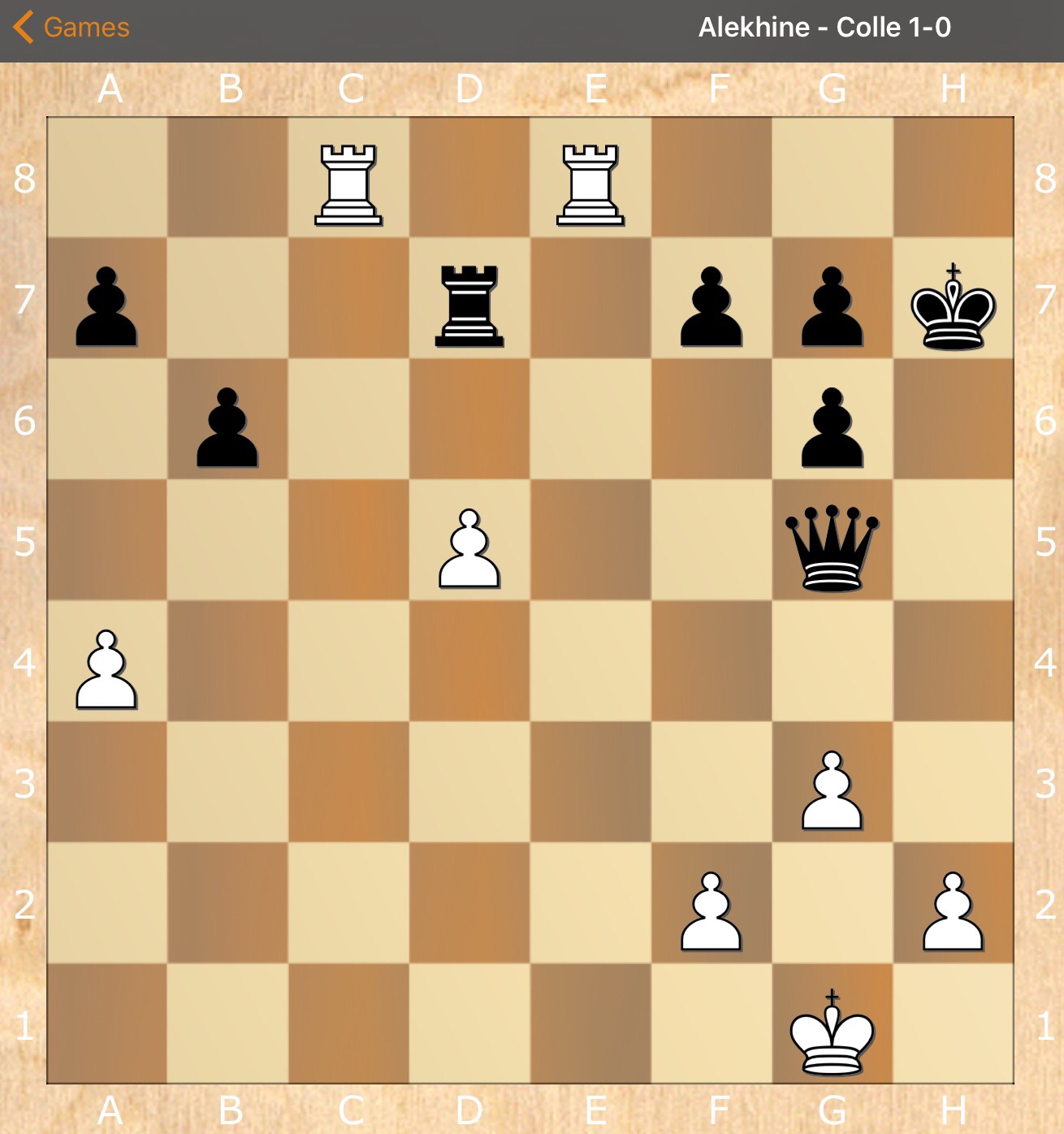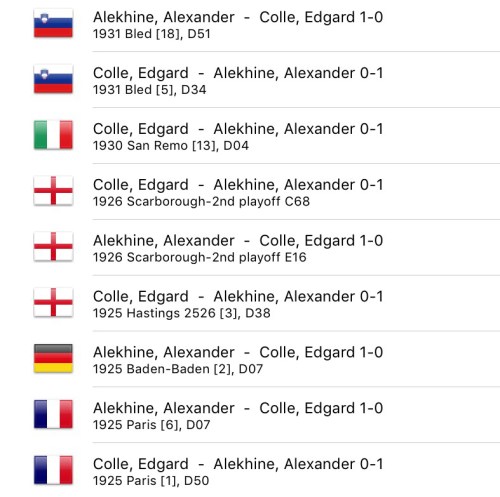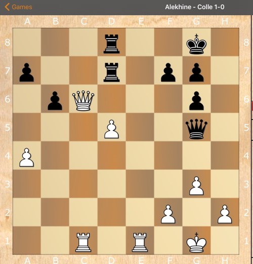To find the positions (I am writing this post on holiday, with only my iPad, and no Megabase) I used Chessbase’s online app: searching for the game, I saw that Alekhine had Colle’s ‘number’: