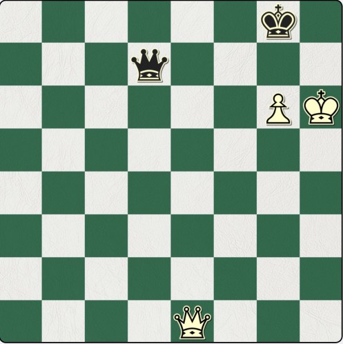 3 Qa8+ Qf8+[] 4 Qf8+ Kf8[] 5 Kh7 and the pawn promotes.
