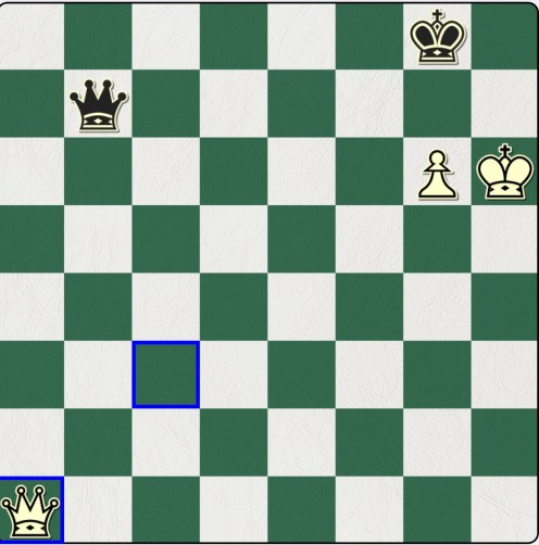 If 1…Qe7, White checks on c8, swaps queens, and the pawn promotes.